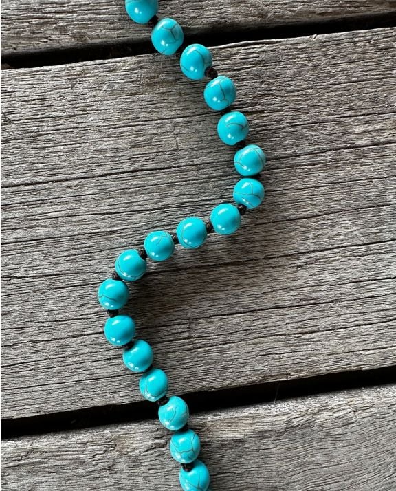 A little western, a little everyday classic—this turquoise beaded necklace is the kind of piece that instantly pulls a look together. Featuring vibrant turquoise-tone round beads with subtle natural marbling, it’s hand-strung with tiny dark spacers that give it beautiful contrast and just the right amount of rustic charm. The longer length makes it perfect for layering with your favorite chains, pendants, or statement pieces, but it’s just as stunning worn solo with a graphic tee, denim shirt, or flowy dress.