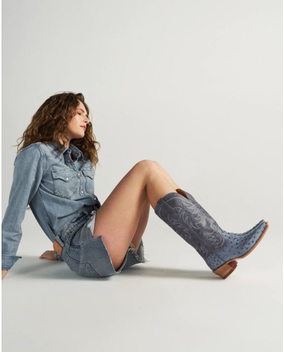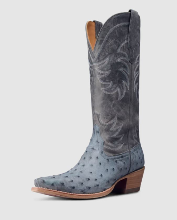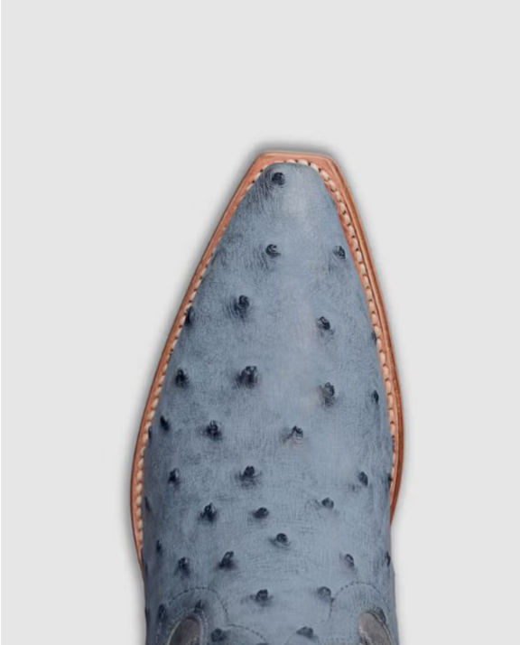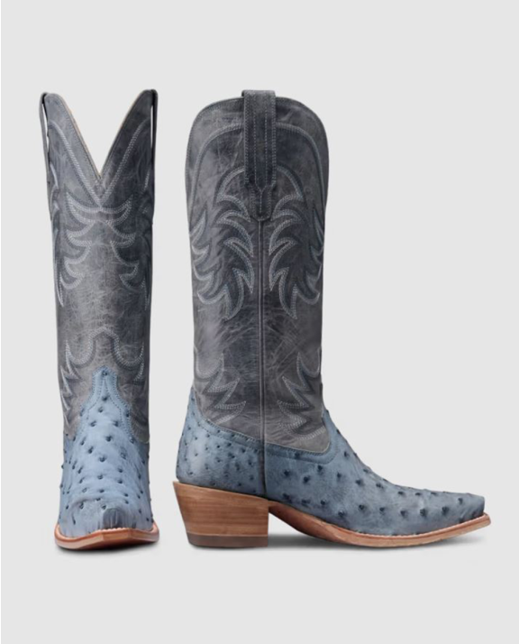 The Annie, in stunning blue exotic, blends timeless design with artisanal craftsmanship. The vamp and counter showcase full quill ostrich with a hand-applied two-tone finish, bringing out rich highs and lows on each quill. The shaft features waxed goat leather, rich in natural oils, with a finish that draws out the leather’s depth and character. A fashion-forward snip toe leads the way, paired with signature toe stitching and a 14” shaft with tonal detail. Wearable, collectible, and built to age beautifully, this is Annie at her most striking.