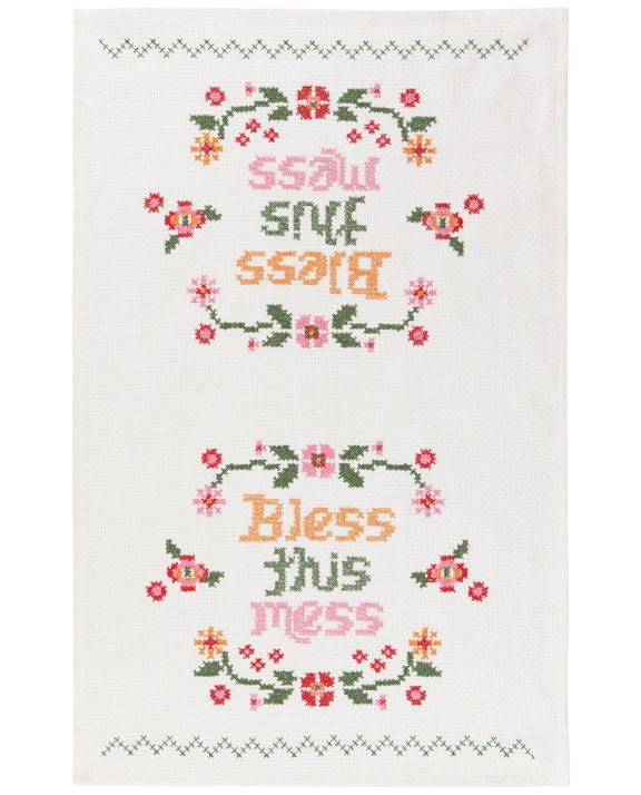 Add a touch of vintage charm to your kitchen with this delightful “Bless This Mess” dish towel. Featuring a colorful cross-stitch inspired floral design and playful lettering, this towel brings cheerful farmhouse style to everyday kitchen tasks. The classic stitched pattern and bright florals give it a cozy, handmade look that pairs beautifully with cottage, farmhouse, or traditional kitchens.