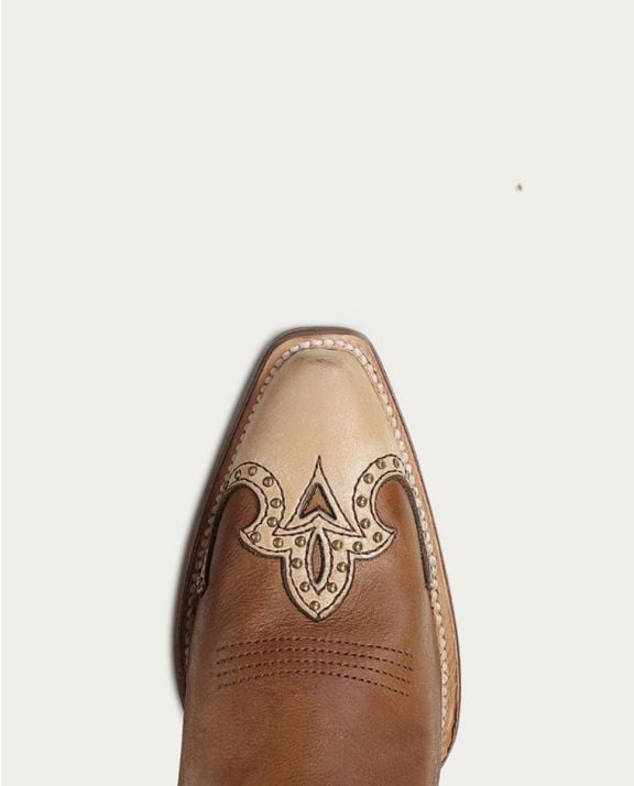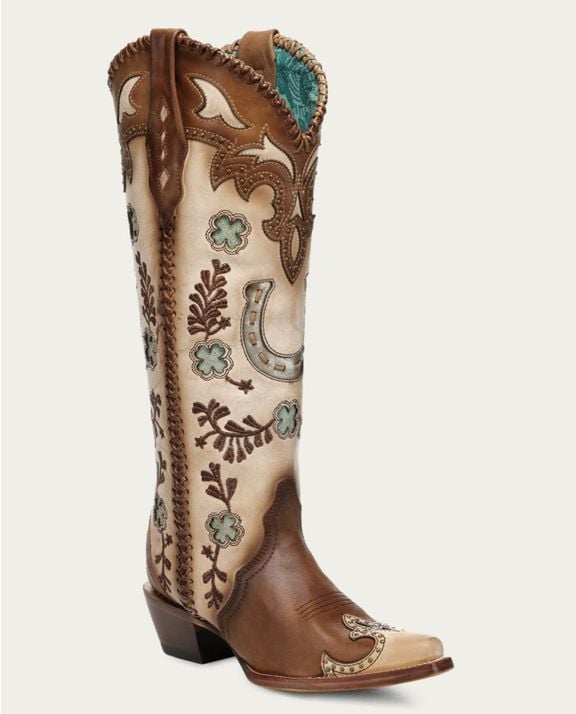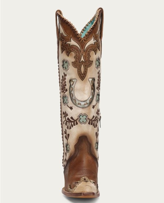 WOMEN'S HONEY HORSESHOE OVERLAY EMBROIDERY AND STUDS HANDWOVEN SNIP TOE TALL TOP COWBOY BOOT