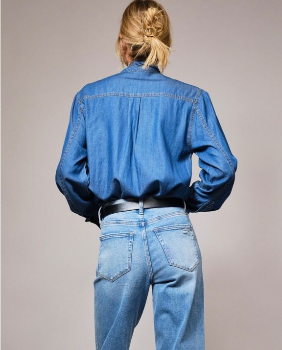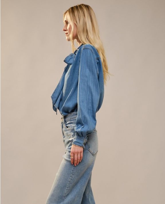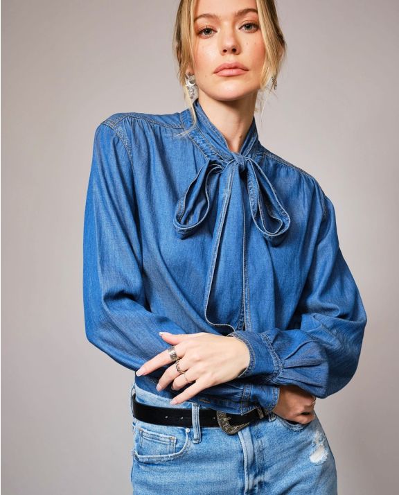 Soft cotton Tencel blend chambray blouse featuring a tie neck, hidden button closure, and long sleeves with button cuffs. Designed with a relaxed fit for effortless styling.