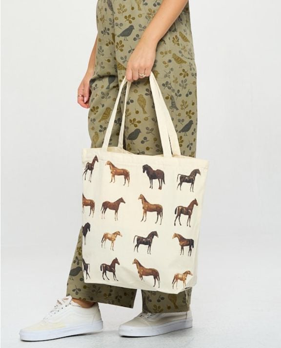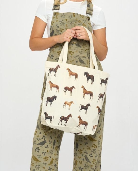 For the horse girl at heart. This charming canvas tote features an allover vintage-inspired horse print on a soft neutral background, giving it that perfectly timeless western feel. Spacious enough for your everyday essentials—books, errands, market runs, or weekend adventures—this tote is both practical and effortlessly cute. Easy to carry, easy to style, and made for anyone who loves a little equestrian charm in their everyday look.