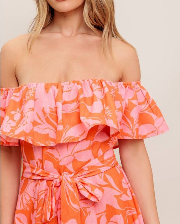 A printed woven midi dress featuring off shoulder neckline with flounce, self sash tie, circle skirt and back zipper closure