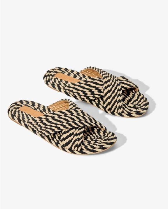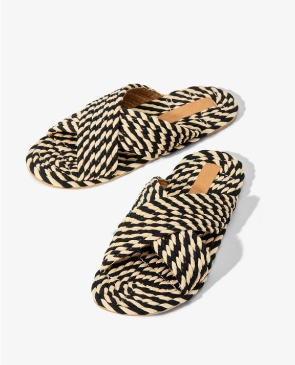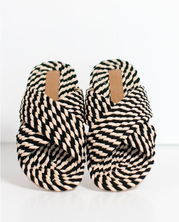Step into sustainability with our 100% vegan rope slide, crafted from natural plant-based fabric woven into unique, hand-applied ropes. Designed in a chic black and cream colorway, this effortlessly stylish sandal is as comfortable as it is eco-friendly. The durable TPR outsole ensures long-lasting wear, making it a staple for seasons to come.