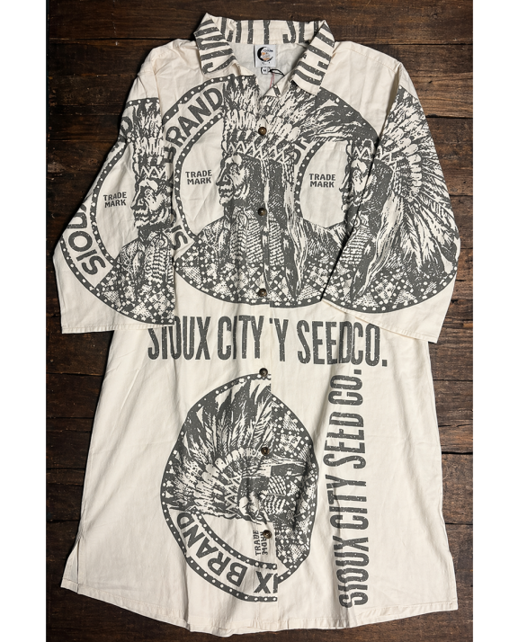 Make a statement with this bold oversized shirt dress featuring vintage-inspired graphic print and effortless boho-western charm. Designed with an eye-catching neutral palette, button-front closure, collared neckline, and relaxed flowy fit, this piece is perfect worn as a dress, layered as a duster, or styled open over denim and a tank. The oversized graphic artwork gives it that perfectly lived-in, artsy feel with a touch of y’allternative edge. Easy, unique, and endlessly versatile—this is the kind of standout piece your closet will keep reaching for.