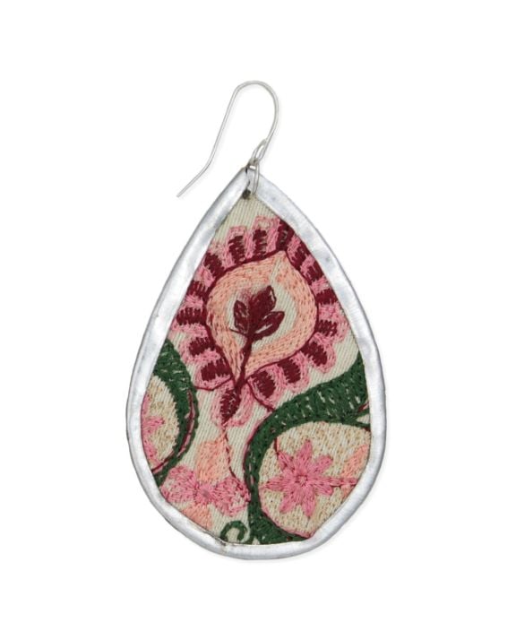 Add a soft pop of color with these silver teardrop earrings featuring pink floral embroidered fabric. Lightweight and full of charm, they blend rustic vintage vibes with modern flair. The intricate stitched blossoms bring cottagecore dreams to life. Perfect for garden parties, brunch dates, or just blooming your everyday look.